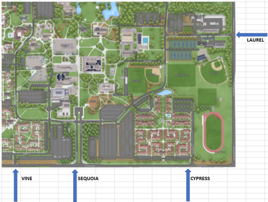 Please use one of the other entrances at Vine Street, Sequoia Way, Cypress Drive, and Laurel Drive. See Image 3.